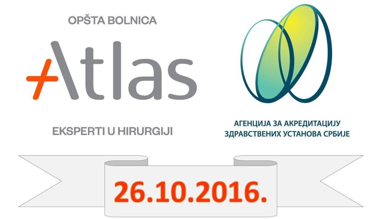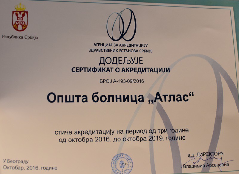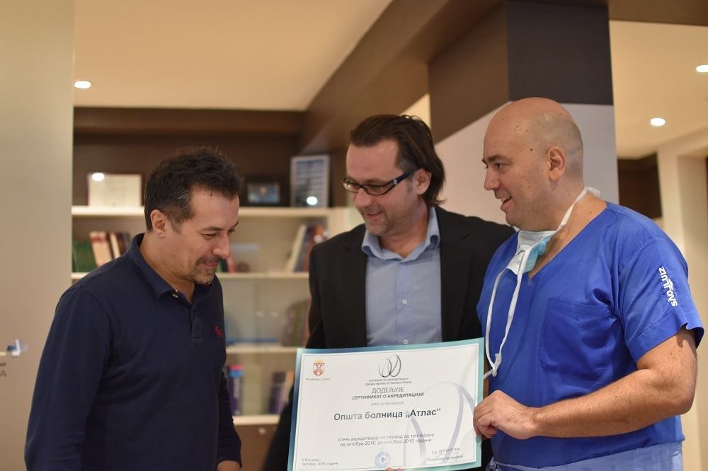 On 26th October 2016. acting director of Agency for Accreditation of Health Care Institutions of Serbia Mr Vladimir Arsenović awarded the certificate of accreditation to Dr Igor Georgijev, director of Atlas General Hospital.
