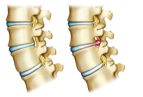 With narrowing of the intervertebral space and loosening the nearby ligament, the disc can prolapse (the disc protrudes from its space) and put pressure on one of the nerves, causing severe pain along the leg, sometimes with a motor deficit (weakness or “fall” of the foot) in some more drastic cases with urination issues.