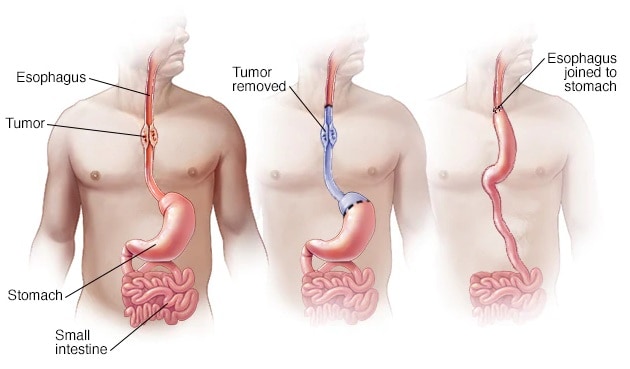 - Surgery to remove a portion of the esophagus (esophagectomy).During esophagectomy, the surgeon removes the portion of your esophagus that contains the cancer, along with a portion of the upper part of your stomach, and nearby lymph nodes. The remaining esophagus is reconnected to your stomach. Usually this is done by pulling the stomach up to meet the remaining esophagus.