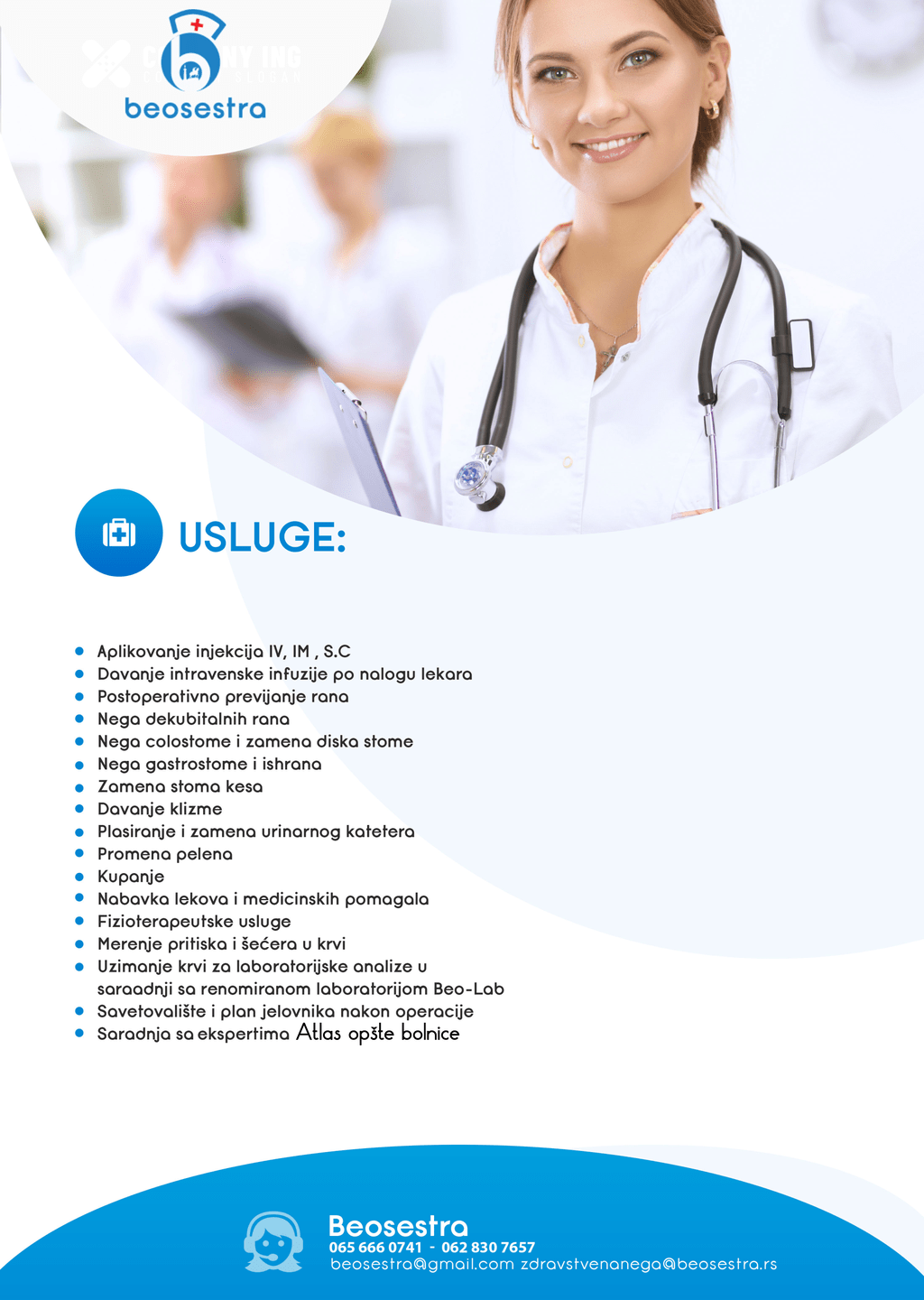 After several years of experience in surgery and medical clinical care, cooperation with experts from all medical fields, there was a need for medical care in home conditions. This resulted in cooperation between Atlas General Hospital and “Beosestra” service. Atlas General Hospital experts will be available to the patients that use “Beosestra” services from now on in home as well as consultative examinations.