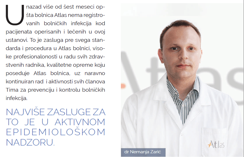 – U Atlas opštoj bolnici unazad nešto više od šest meseci, rekao nam je dr Nemanja Zarić, opšti hirurg Atlas bolnice, nema registrovanih bolničkih infekcija, kod pacijenata operisanih i lečenih u ovoj ustanovi.