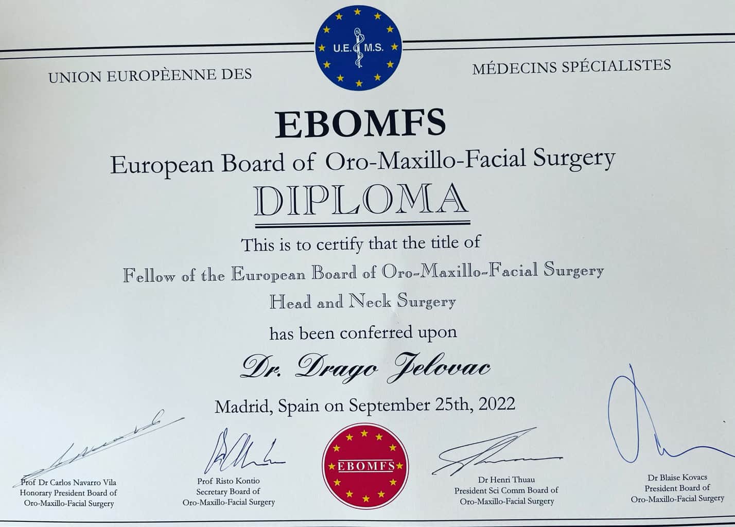 Jedini je maksilofacijalni hirurg u zemlji sa licencom Evropskog Odbora za Oralnu i Maksilofacijlanu hirurgiju i Hirurgiju Glave i vrata.