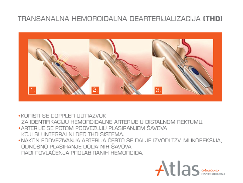 Operacija hemoroida THD metodom predstavlja najsavremeniji vid lečenja hemoroidalne bolesti, kojom se bez reza vrši podvezivanje hemoroidalnih arterija i rešavaju se prolabirani hemoroidi. Transanalna hemoroidalna dearterijalizacija THD je minimalno invazivan hirurški pristup u lečenju hemoroidalne bolesti. THD koristi dopler sondu za lociranje arterija koje dovode krv do hemoroida. Podvezivanjem arterija sprečava se dotok krvi do hemoroida. Postupak traje oko 30 minuta i izvodi se u opštoj anesteziji. Nema hirurškog uklanjanja tkiva, tako da postoji minimalan postoperativni bol. Operacija hemoroida ovom metodom Vas brzo vraća vašim svakodnevnim aktivnostima.