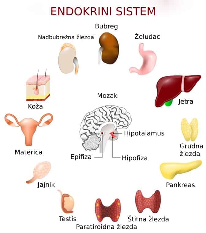 U sastav endokrinog sistema (sistem žlezda sa unutrašnjim lučenjem) ulaze: hipotalamus i hipofiza, štitasta žlezda (tireoidea) , paraštitaste žlezde (paratireoidne žlezde), pankreas (jedan deo), nadbubražne žlezde, jajnici i testisi.